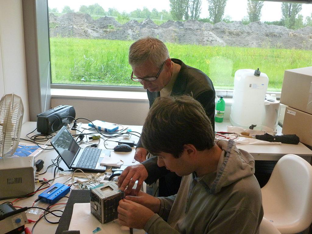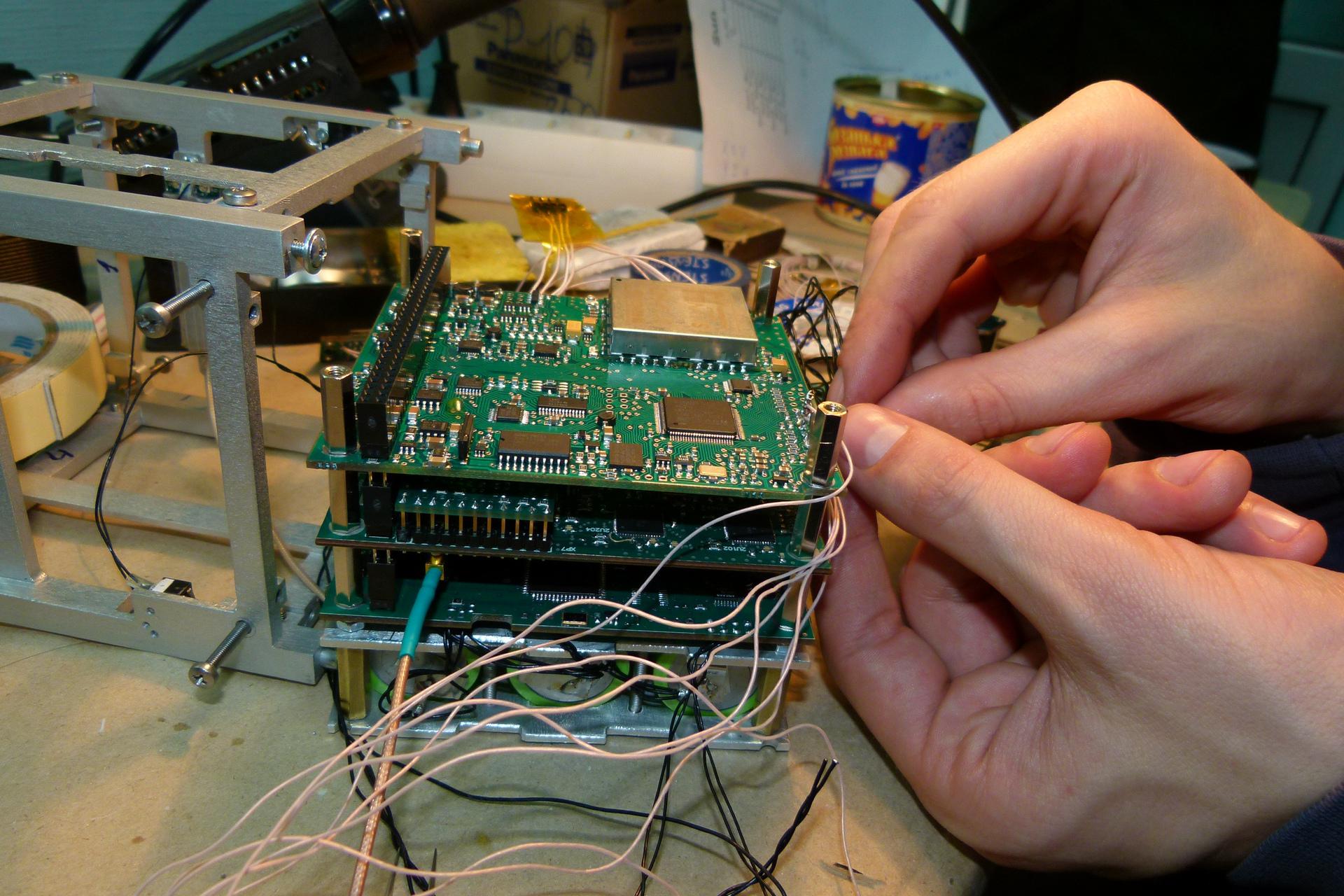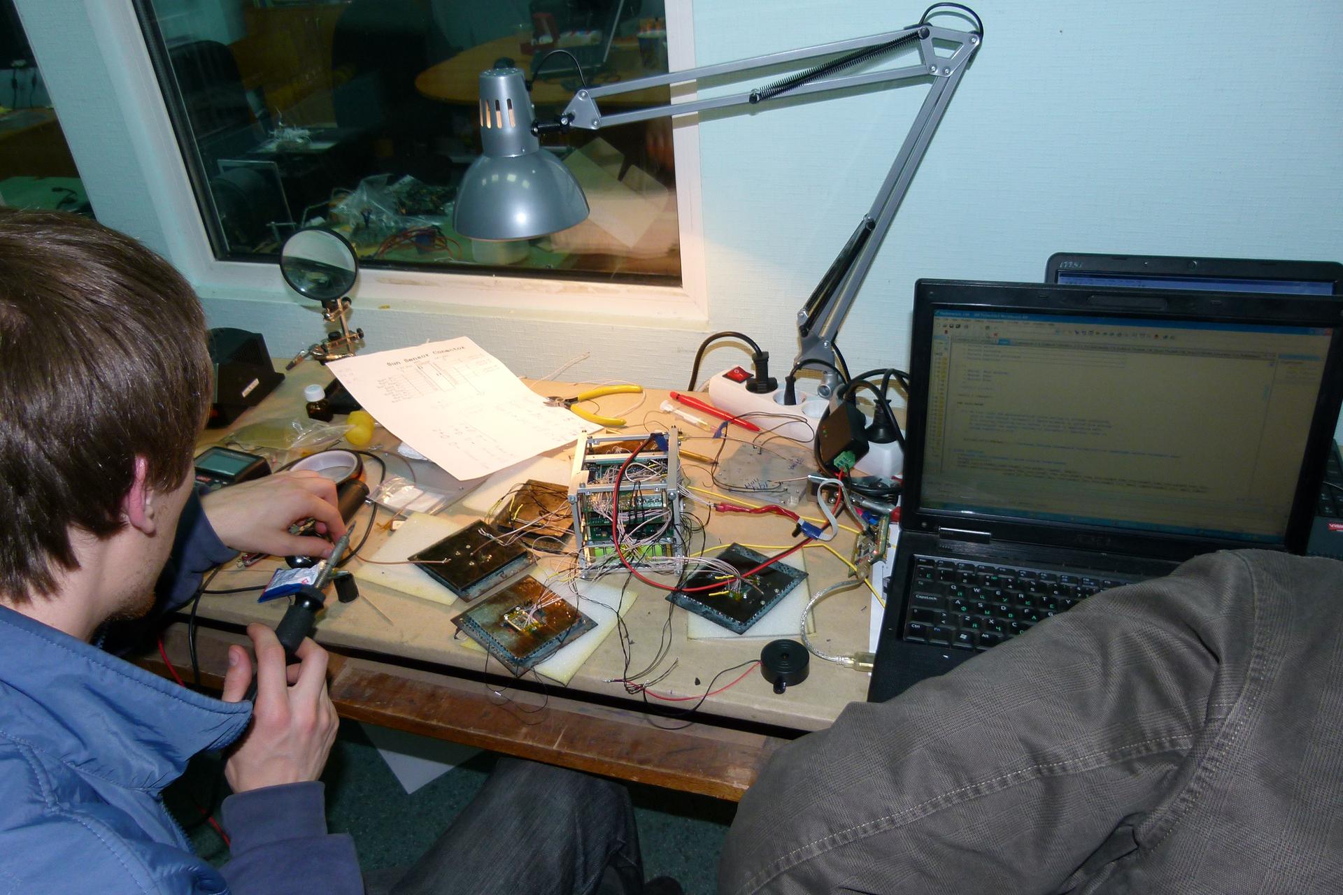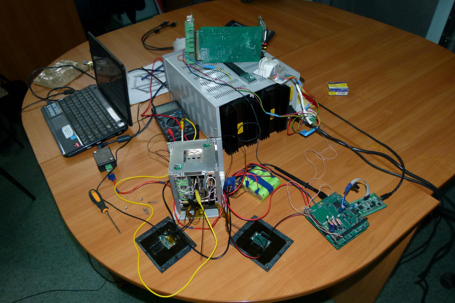 Собрав платы вместе, довольно долго отрабатывали различные алгоритмы и режимы спутника. Обычное состояние рабочего места: блок питания при помощи полуразобранного устройства, имитирующего солнечные батареи с попаданием в тень Земли, питает спутник с аккумуляторами. Проверяли, в каких режимах аккумуляторы успевают заряжаться, а в каких нет.