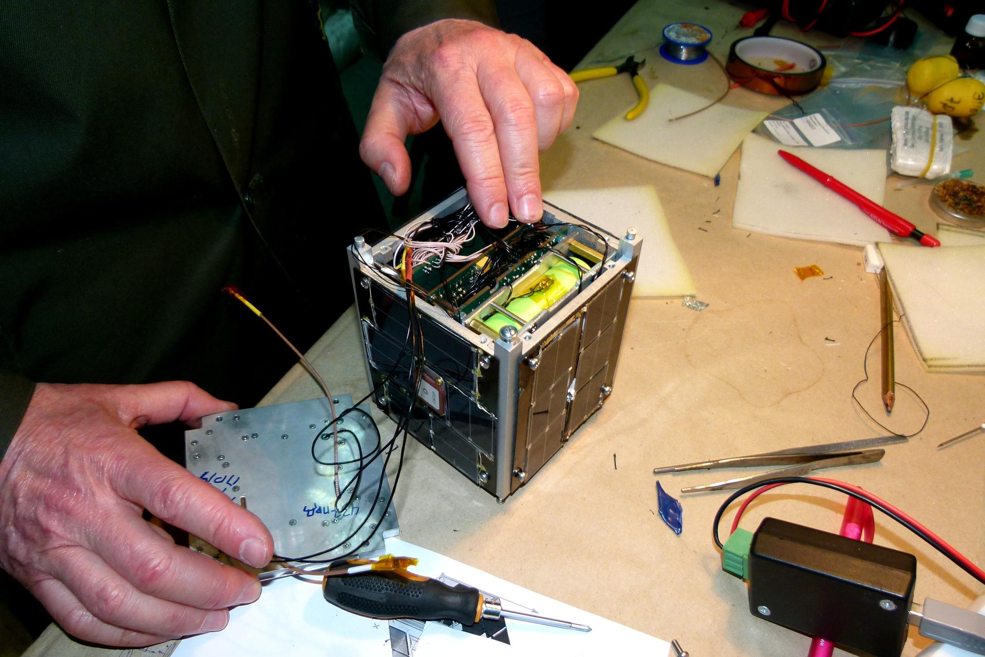 Сборка в подвальном помещении лаборатории вместе с проверкой всех подключаемых элементов заняла больше суток. Довольно ответственная работа, выполняя которую, нужно по сборочным чертежам соединить платы, объединить проводами все элементы спутника в единую систему (платы, внешние датчики, аккумуляторы, солнечные батареи, механизм расчековки антенн, магнитные катушки управления), подсоединить радио и GPS/ГЛОНАСС антенны, правильно установить на панелях датчики направления на Солнце, сами панели прикрутить к спутнику. И в конце подготовить спутник к транспортировке: