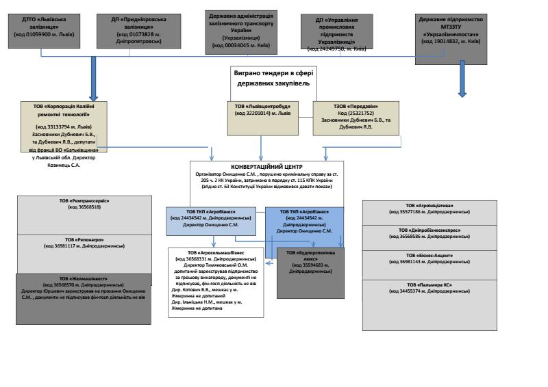 Остапюк с Лозинским не просто возвращают старые тендерные схемы, а еще и организовали «отмывку» и обналичивание украденных государственных средств в незаконном конвертационном центре, прокачивая деньги через львовское предприятие «Коропорацiя Колiйнi Ремонтнi Технологii». В криминальный проект вовлечены также ряд структур и подразделений «Укрзализныци»: «Укрзализнычпостач», Госадминистрация железнодорожного транспорта Украины, «Приднепровская железная дорога», «Львовская железная дорога» и т.д.