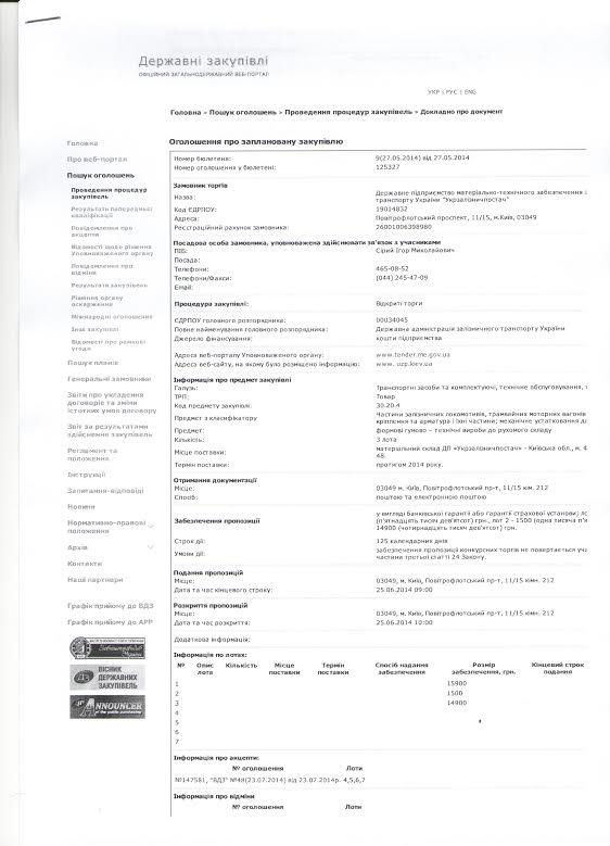 Даний факт підтверджується річним планом державних закупівель ДП «Укрзалізничпостач» на 2009 рік, п. 76 та матеріалами його підготовки.