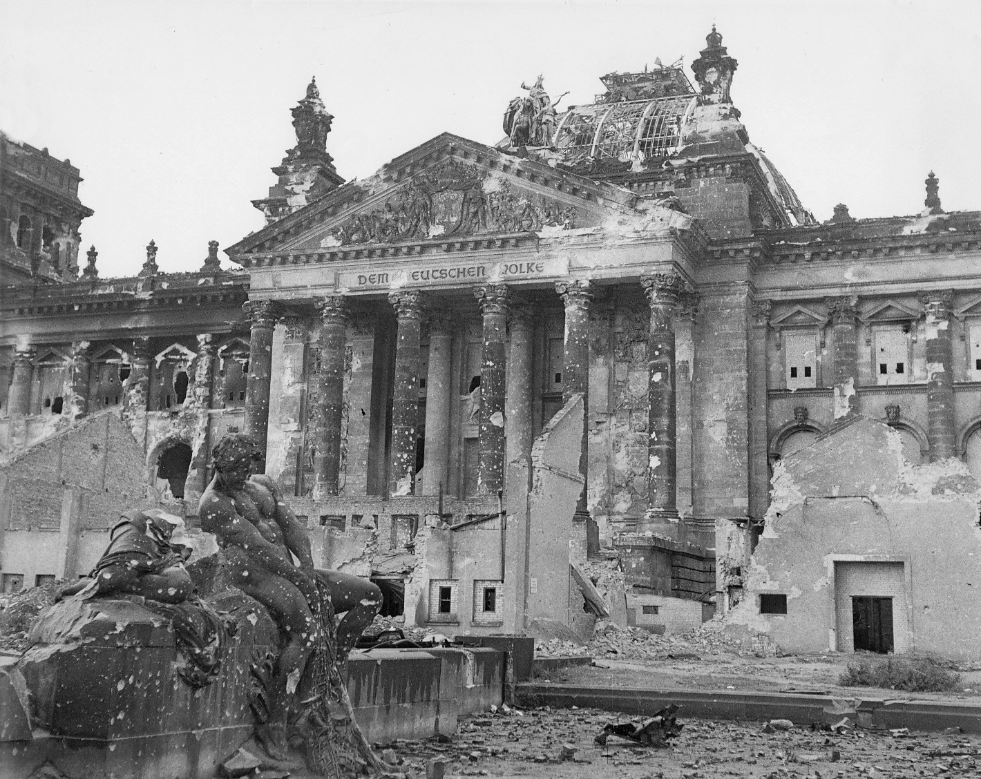 -- надо вниз, на состояние улицы под Рейхстагом смотреть -- уже трамваи ходили, а знамя, всё ещё воодружалось...