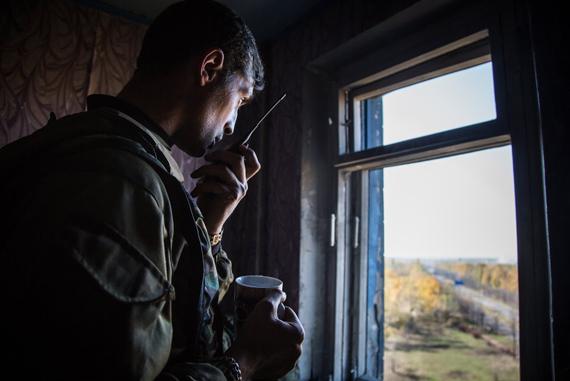 Гиви курит в маленькой кухне на седьмом этаже. Без брони, в обычной униформе с кружкой чая. На вид ему лет 35, высокий и смуглый. Перед окном с выбитой рамой сидят еще двое бойцов помоложе. На подоконнике шипят штук семь раций. Но никто не отвечает. В соседней комнате в бинокль смотрит девушка с шевроном "Отряд Гиви". В метрах восьмистах - здание нового терминала и его раскуроченные стены. В квартире этой - что-то вроде смотровой площадки.
