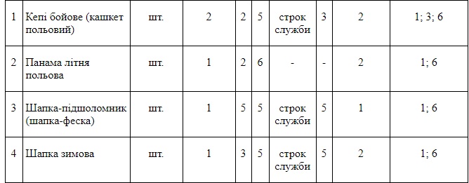 З головних уборів як бійцям Збройних Сил України, так і бійцям Національної Гвардії України згідно з нормами єдиного бойового комлпекту мають видавати дві бойові кепі, літню польові панаму, шапку-феску (шапку-підшоломник) та шапку зимову.