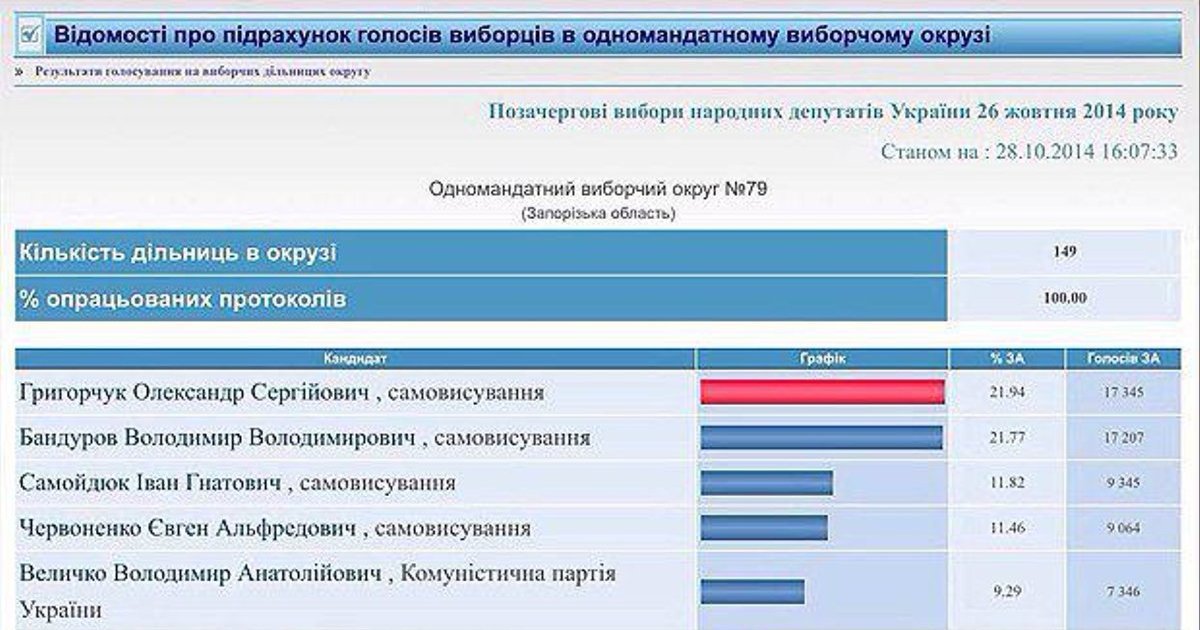 Ситуация, сложившаяся на 79-ом избирательном округе в Запорожской области, напоминает худшие аналоги времен сбежавшего в Россию президента Януковича. Для искажения воли избирателей были задействованы Администрация президента, суды в Киеве, Днепропетровске и Запорожье, Центральная и окружная избирательные комиссии, районная прокуратура и вооруженные бандформирования.
