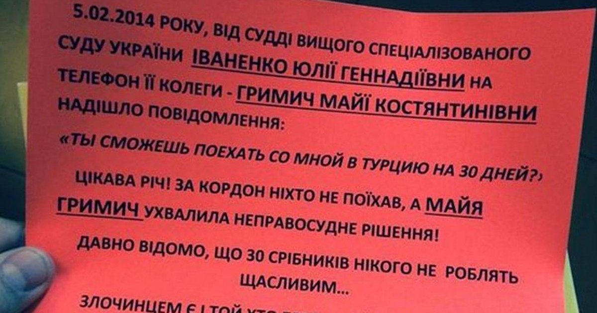 Кроме того, в ряде районов Киева уже сегодня можно обнаружить яркие листовки следующего содержания: "5.02.2015 года от судьи Высшего специализированного суда Украины Иваненко Юлии Геннадьевны на телефон ее коллеги Гримич Майи Константиновны пришло сообщение "Ты сможешь поехать со мной в Турцию на 30 дней?". Интересная вещь! За границу никто не поехал, а Майя Гримич утвердила неправосудное решение! Давно известно, что 30 серебряников никого не делают счастливым… Преступником является и тот, кто берет, и тот, кто дает взятку!". Мы следим за развитием событий…
