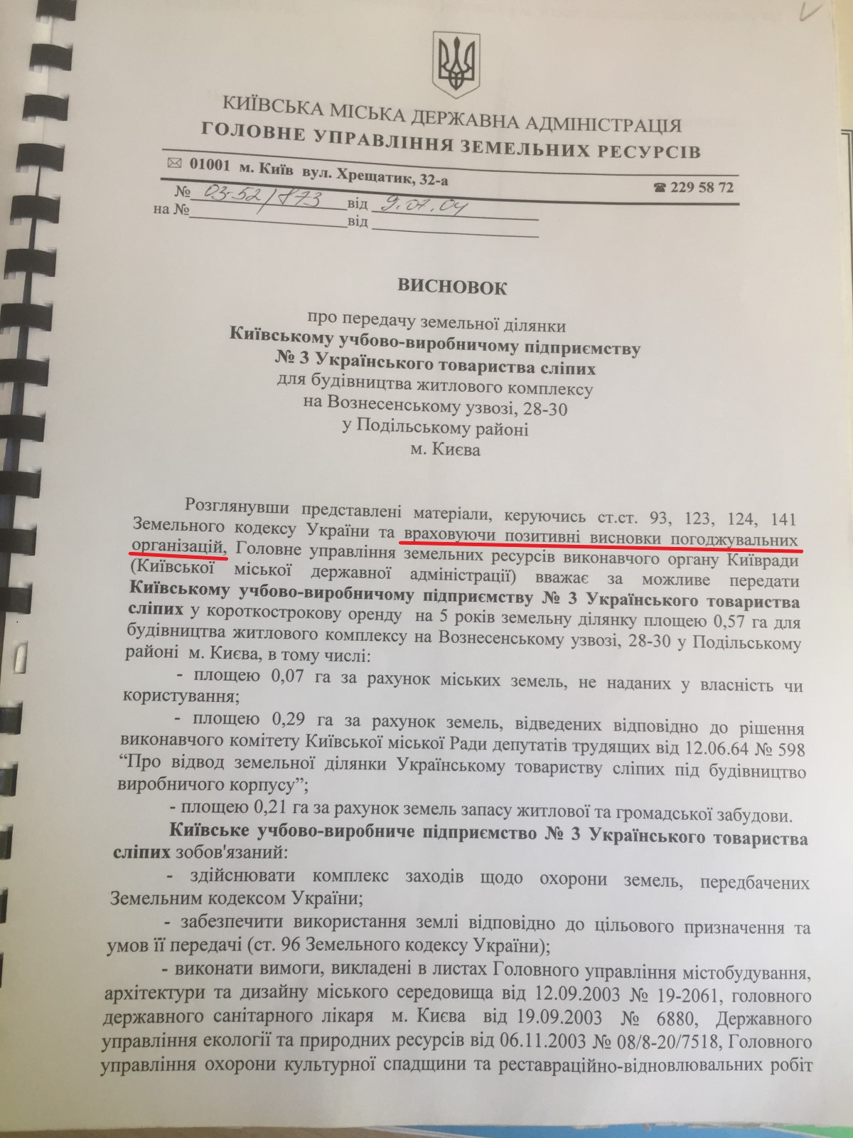 Спустя почти два года, в 2004, вопреки отрицательным выводам управлений и комиссий проект решения минует стадию согласования и оказывается в Главном управлении земельных ресурсов КГГА. В нарушение закона начальник управления Анатолий Муховиков ставит под ним подпись и даже подчеркивает "положительные заключения согласительных организаций".
