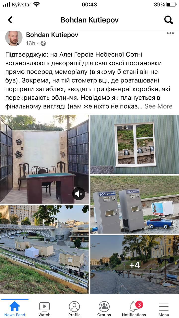 Зранку у вівторок відомий журналіст Богдан Кутєпов виклав фото інсталяцій на Алеї Небесної сотні, де копії совєцького побуту закривали обличчя загиблих 18-20 лютого під час Революції Гідності. Кутєпов попередив, що владі варто було б швидко пояснити сенс цієї локації, інакше скандал буде гучним.
