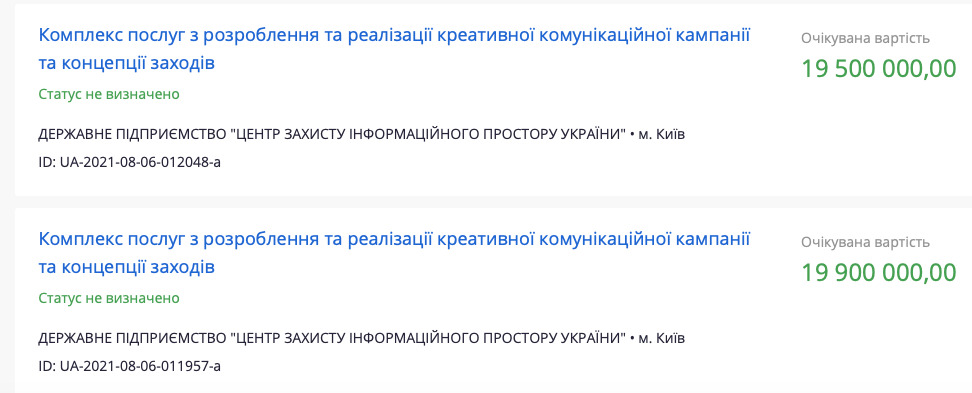 Втім, це все незначні суми порівняно зі створенням концепції свята. За них Приватне Підприємство "ПКС" отримало 19, 5 млн. А Товариство з обмеженою відповідальністю "Спецекспотрейд" – 19,9 млн.