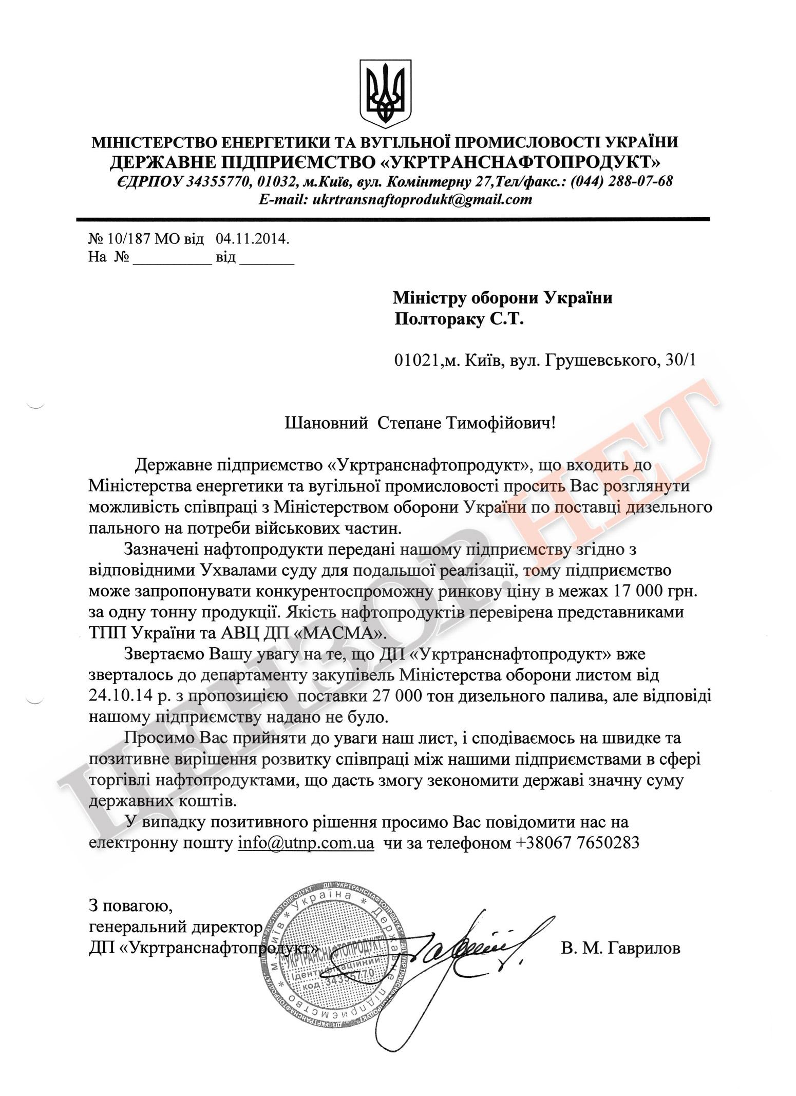 Более того, как стало известно из надежных источников, одно из государственных предприятий, занимающихся дизельным топливом, а именно - ГП "Укртранснефтепродукт" неоднократно в течение октября-ноября 2014 года обращалось к министру обороны Украины Степану Полтораку, а также к директору департамента закупок Минобороны Александру Зражевскому с предложением о сотрудничестве. Госпредприятие предлагало поставлять дизельное топливо на нужды военных частей по цене не превышающей 17 000 грн за тонну.