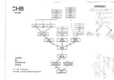 Схема наведена англійською мовою. На ній є позначки олівцем – почерк один в один схожий на почерк Тимошенко. Можливо, саме ці домальовані позначки напевне і мали свідчити про причетність до "банківської групи" акціонерів "РосУкрЕнерго"? Адже в самій схемі згадки при них немає…