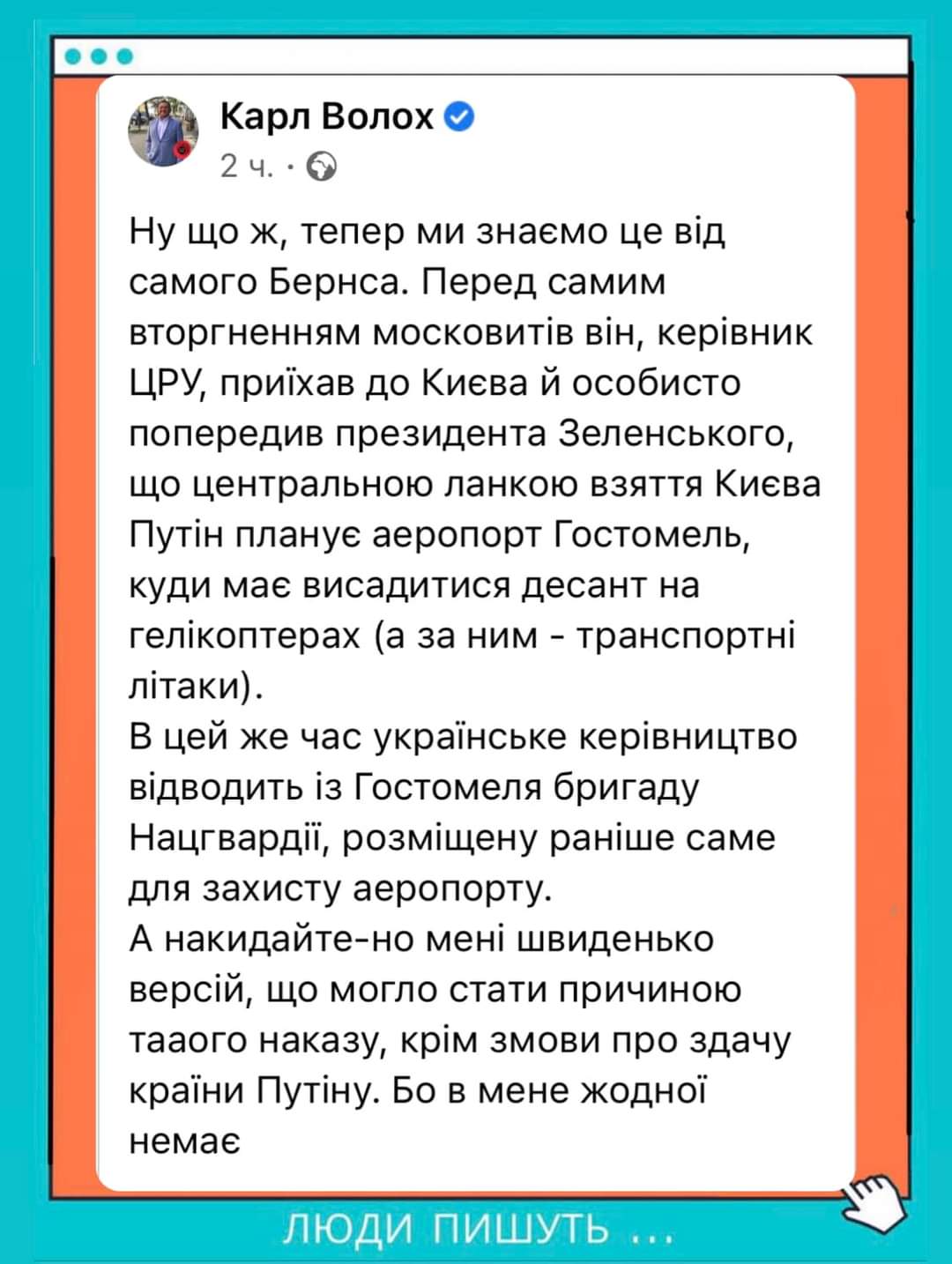 21 лютого я отримав деталізовану інформацію від Державної прикордонної служби про напад росіян на Гостомель на гелікоптерах 24 лютого. Виліт з Білорусі, маршрут прольоту - через Чорнобильску зону, ціль атаки - захоплення аеродрому Гостомель. У першій хвилі - 60 гелікоптерів. Якщо буде суд по цих подіях, будуть і свідки і свідчення. Ця інформація підтверджувалась планами вторгнення, які друкували британські та американські видання з посиланням на розвідку.