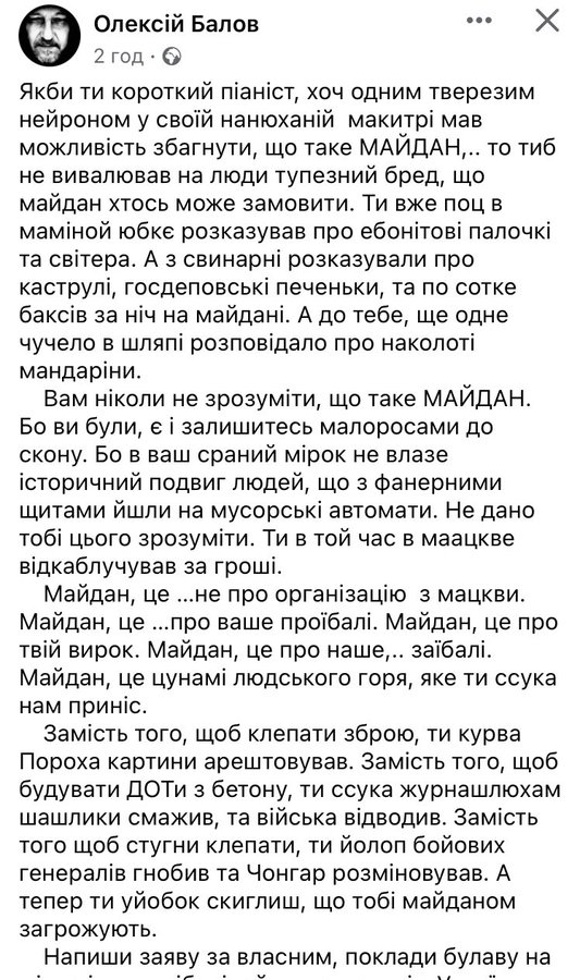 А воно паплюжило пам'ять Майдану починаючи з 2013 року, насміхаючись над над самою ідеєю Майдану, над учасниками, потім над ВСУ та ВМФ, потім своїми виступами перед окупантами, а потім своїми діями вже на президентському посту ("Вагнергейт", "обмін" цемаха і т. п.) послідовно до цього дня.
