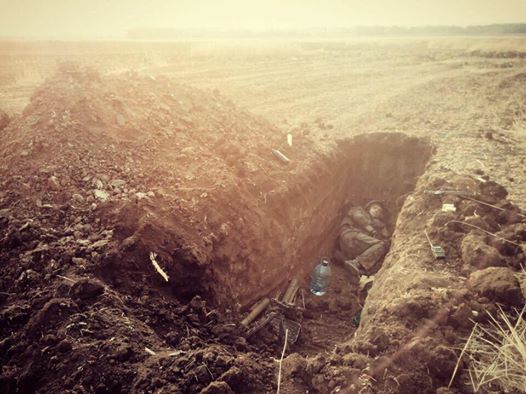 Сменив его на рассвете в последний раз, я воспользовался затишьем между миномётными обстрелами и вылез из окопа, чтоб отлить в кусты. Ибо за ночь окоп уже провонялся мочой. Сделав своё мокрое дело, я обернулся и увидел, что свет очень мягко ложится. Достав свой смартфон из-под броника сделал фото, на память. За год это фото объедет Брюссель, Страсбург, Лондон, Вашингтон. Хотя кто тогда об этом думал.