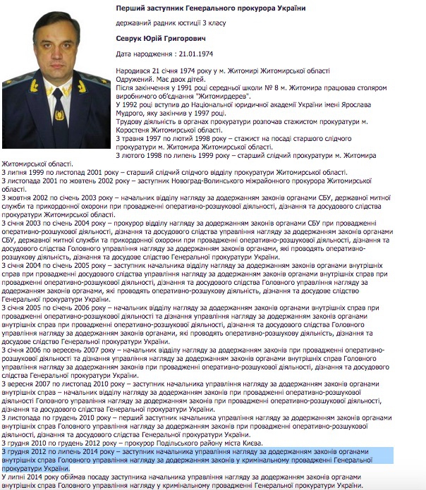 И если господин Севрук хочет продолжить своё беззаветное служение закону, то ему следует быть осторожней на виражах. Благодатная для него эпоха Януковича/Пшонки, во время которой он занимал должности прокурора Подольского района г.Киева и заместителя начальника управления надзора за соблюдением законов органами внутренних дел ГПУ, то есть непосредственно курировал все уголовные производства, которые МВД эпохи Захарченко фальсифицировало в отношении участников Революции Достоинства, давно завершилась.