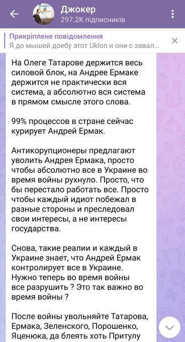 Власне, у своєму розслідуванні журналісти Форбс-Україна називають ТК Джокер анонімним, але всі давно знають, що цей телеграм-канал обслуговує голову Офісу президента.