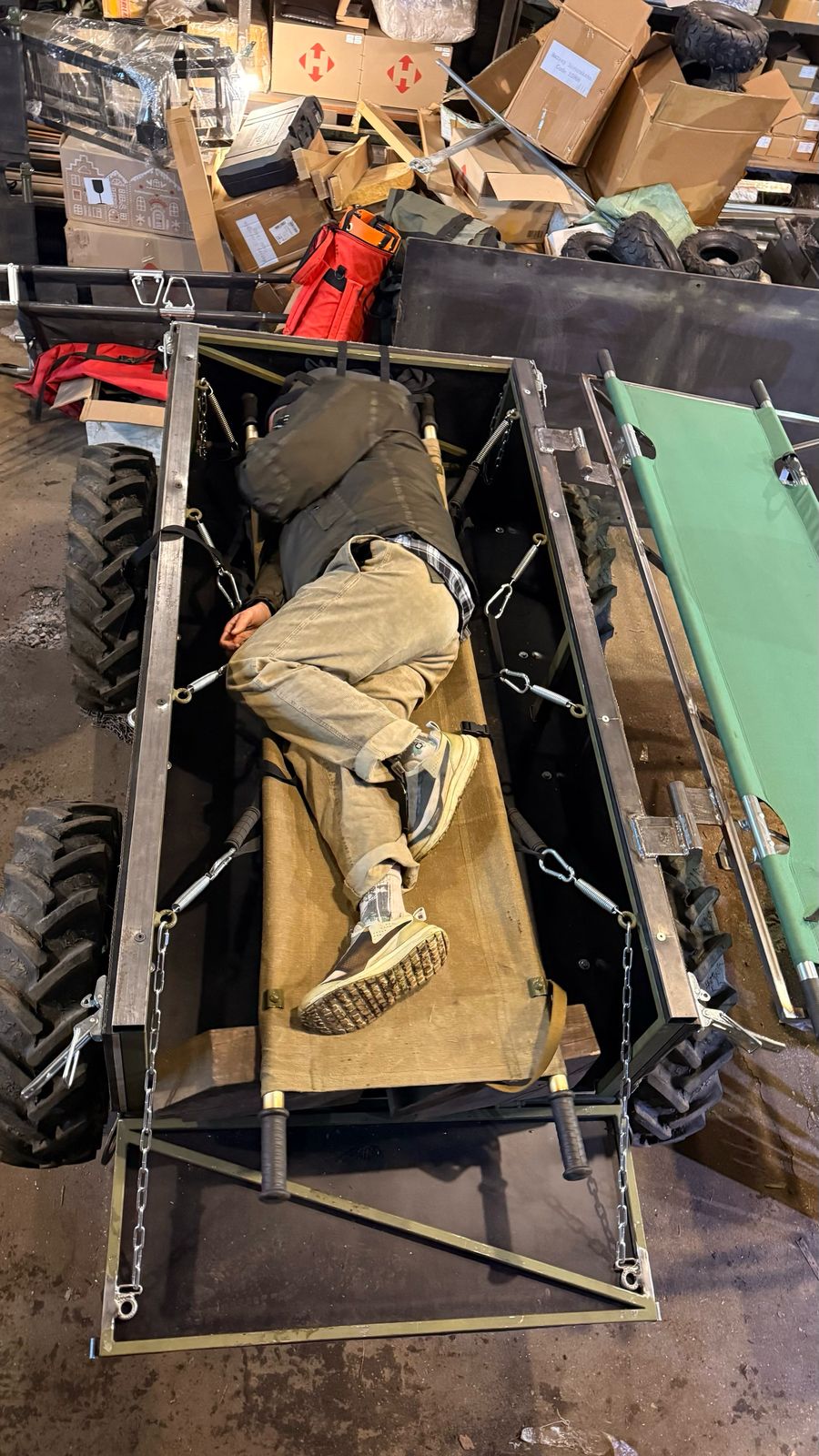 Ще момент, який ми побачили. На момент створення автівки на тамошніх ношах можна було забрати лише одного лежачого і 4 сидячих. Зрозуміло, що на точку збору поранених по одного важкого ніхто їхати не буде. Приїхати - і не мати, куди його покласти? Тому ми розробили схему, яка збільшила кількість місць для важкопоранених - до чотирьох. (А за необхідності можна і п’ятого покласти між рядами). Зробили двоярусні ноші з системою завантажень. Покращили деякі моменти, що стосувалися світломаскування. Покращили ергономіку салону.