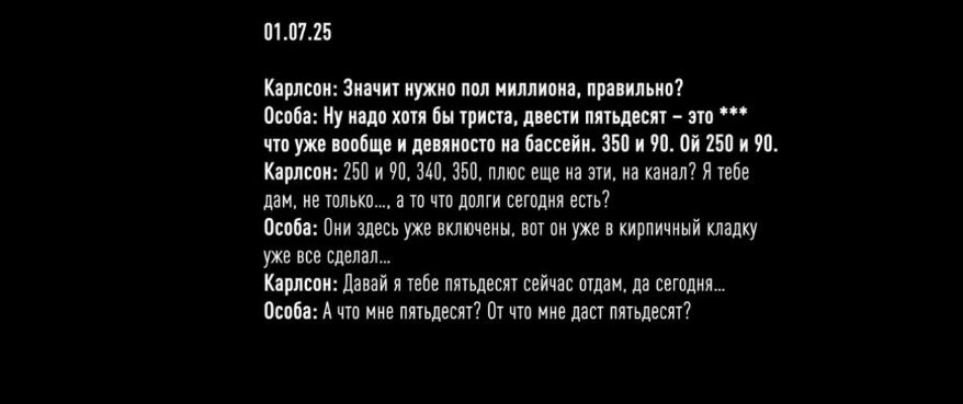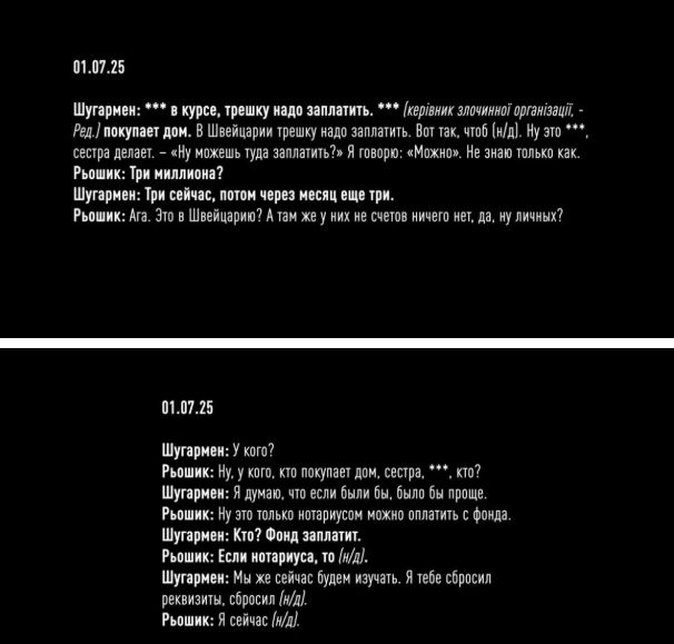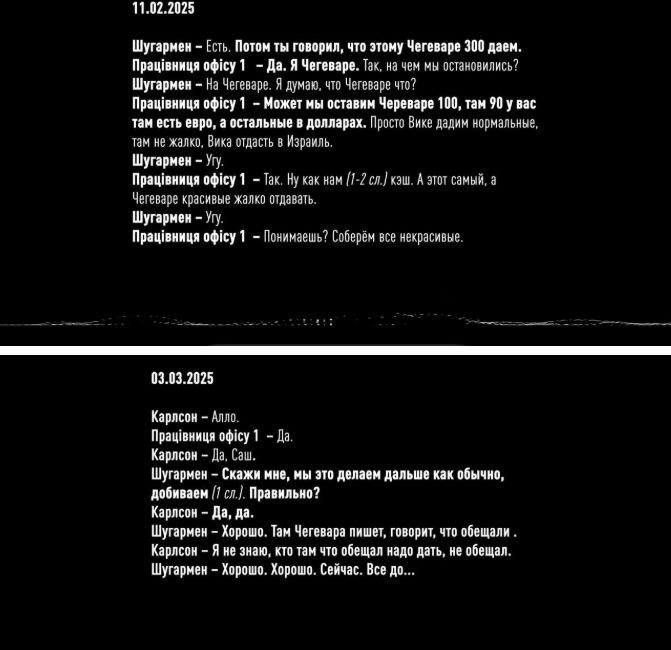 Один з них датований 14.07.2025. Він містить фрагмент розмови між Карлсоном, міністром енергетики Галущенком та Шугерменом. Під час зустрічі Галущенка викликає до себе президент, і учасники розмови обговорюють цей факт.