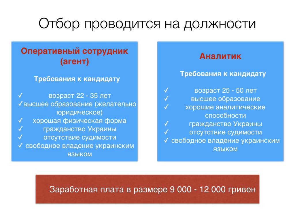 Отбор проводится на две категории должностей в БПН: оперативных сотрудников (агентов) и аналитиков. Первые призваны работать "в поле", поэтому идеальный кандидат должен пребывать в отличной физической форме и обладать высоким уровнем эмоционального интеллекта, уметь налаживать контакты. Корпус аналитиков составит мозговой центр БПН, итоги их работы будут предоставляться подразделениям полиции для предотвращения и пресечения наркопреступлений.