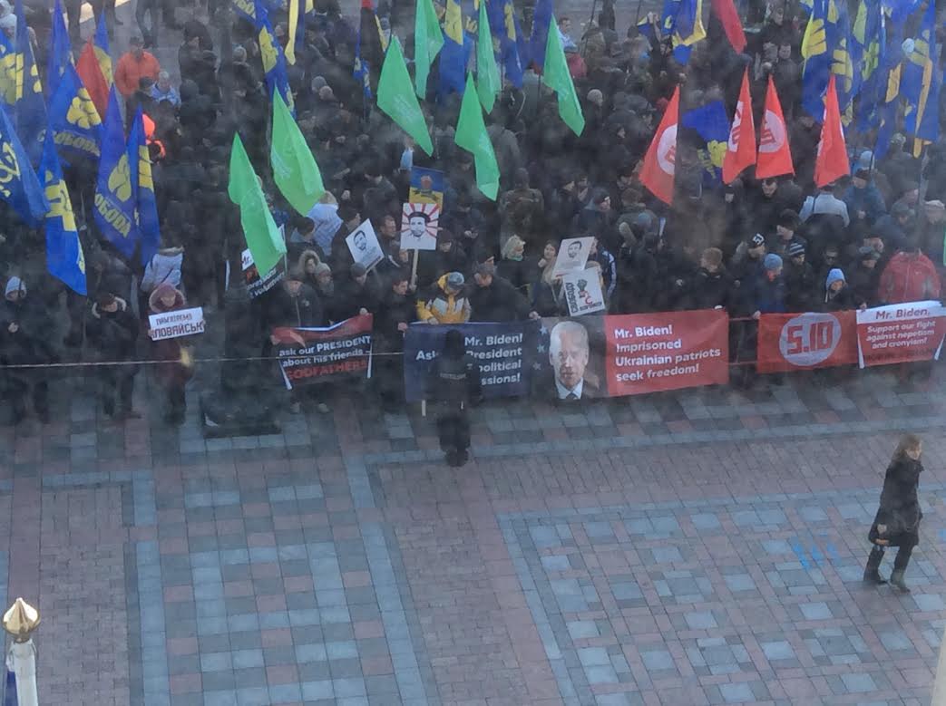 Таксист не соврал: еще в половину десятого дороги, ведущие к парламенту, были свободны. Но уже к началу одиннадцатого улицу Грушевского перекрыли активисты "Свободы", "УКРОПа" и еще нескольких партий. Выгляни Джо Байден в окно, он увидел бы, что протестующие неплохо выучились писать его имя. На принесенных толпой транспарантах было пропечатано: "Мистер Байден! Заключенные украинские патриоты стремятся к свободе!". И: "Мистер Байден! Спросите нашего президента о его друзьях, крестных отцах!"