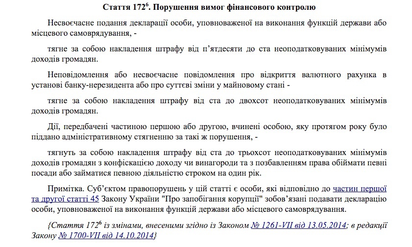 Однако, как мы видим, Дунаев указывает 999 300 грн в качестве суммы годового взноса, таким образом занижая ее в десять раз по сравнению с фактически задекларированными данными. Сухим юридическим языком это называется "Нарушение требований финансового контроля". По стечению обстоятельств, именно так называется статья 172-6 Кодекса Украины об административных правонарушениях.