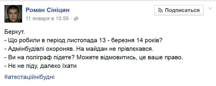Роман Синицын: "На аттестации "Беркут" ведет себя нагло, вызывающе. Все, как один, твердят, что ни в чем таком на Майдане участия не принимали. Многие отказываются идти на полиграф"