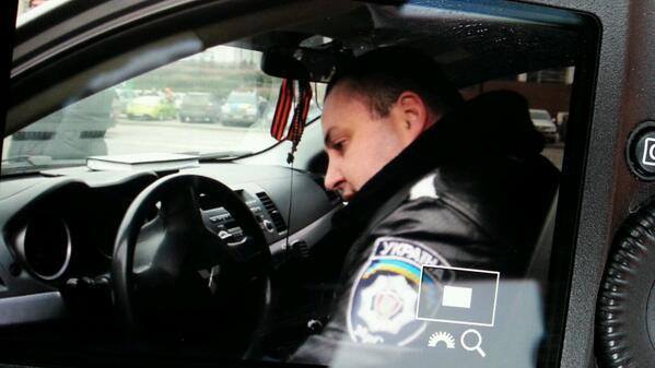 Машины Автомайдана пытался остановить не установленный подполковник ГАИ на Европейской площади - в его машине висела георгиевская ленточка, уже тогда служившая символом пророссийских настроений. Когда люди потребовали от гаишника прекратить незаконные действия, он угрожал пистолетом.