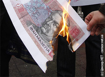 Тревога по поводу неспособности политиков преодолеть свои разногласия уже оказывает свое воздействие и на валюту. Курс гривни приближается к годовому минимуму. Сейчас за девять гривен дают один доллар, а министерство финансов называет это "паникой и спекуляцией". И такие тенденции совпали по времени с тяжелым бременем выплат по внешним долгам, срок которых для компаний наступил в августе.