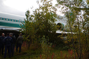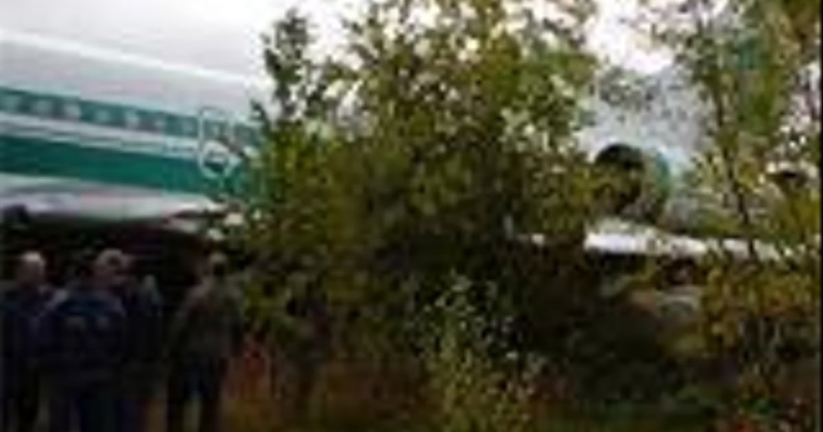 После двух неудачных заходов лайнер все-таки удалось посадить, однако места для торможения было слишком мало. Машина выкатилась за пределы полосы. К счастью, за бетонкой шло редколесье — опушка, заросшая невысокими сосенками. Самолет буквально срезал верхушки деревьев. Колеса многотонного лайнера тут же зарылись в землю, однако остановиться «Ту» смог только через 200 метров.
