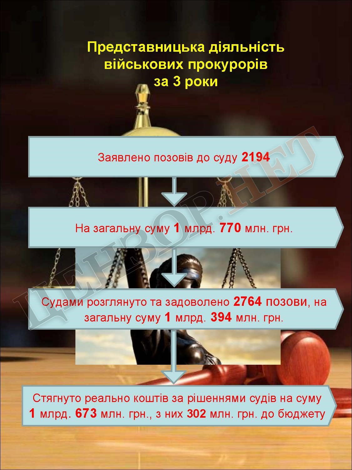 За три года деятельности военная прокуратура задержала 1968 человек, провела 6611 обысков, арестовала имущества на сумму более 7 миллиардов грн, возместила государству средств на сумму 345 миллионов гривен.