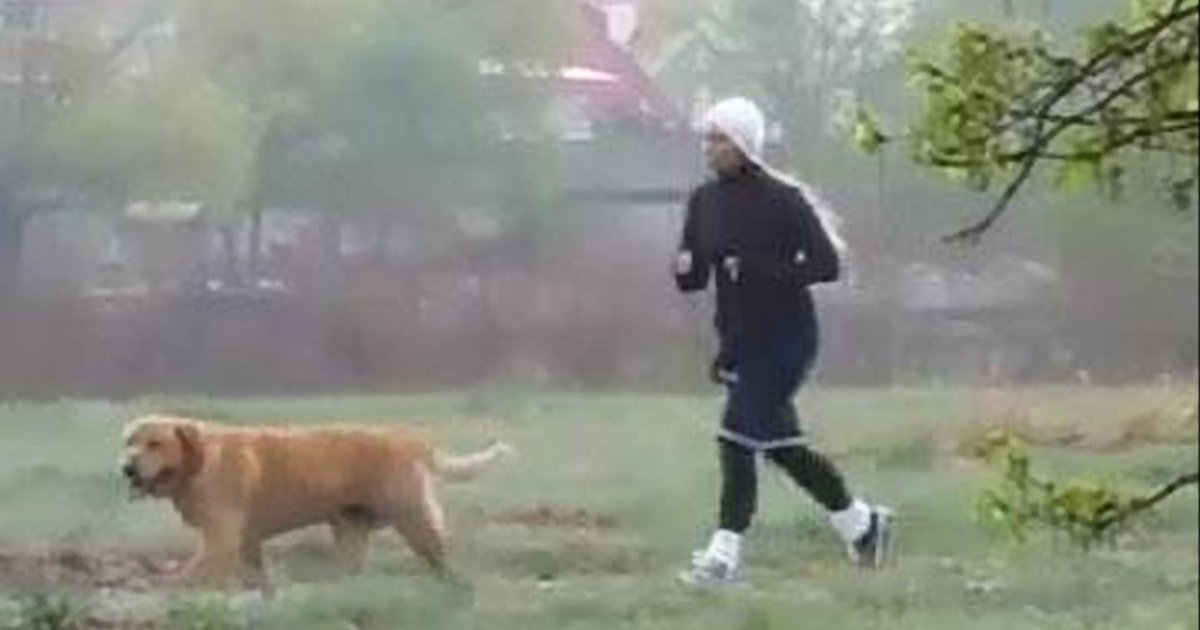 На видео видно, как женщина с длинными белыми волосами бежит на природе вместе с мужем (якобы охранником) и собакой.