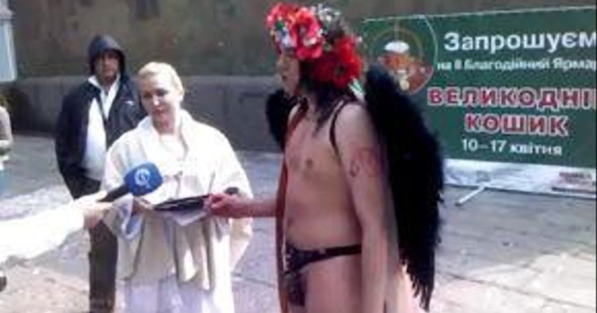 Через несколько минут после начала акции под Лавру с криками подбежали парень с венком на голове в одних трусах, высоких сапогах и прикрепленными к спине черными крыльями, а также девушка в черном топе, белой юбке и с красными крыльями.