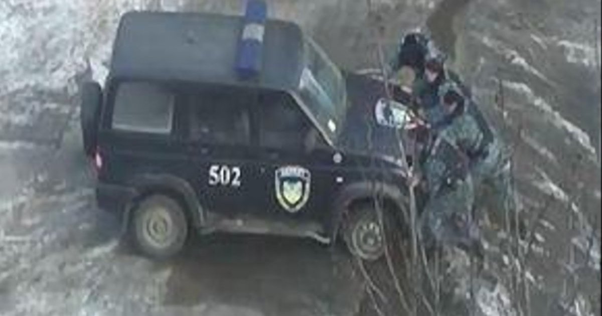 В Днепропетровске во дворе одного из домов патрульный автомобиль «Беркута» застрял при попытке пересечения потока канализации.