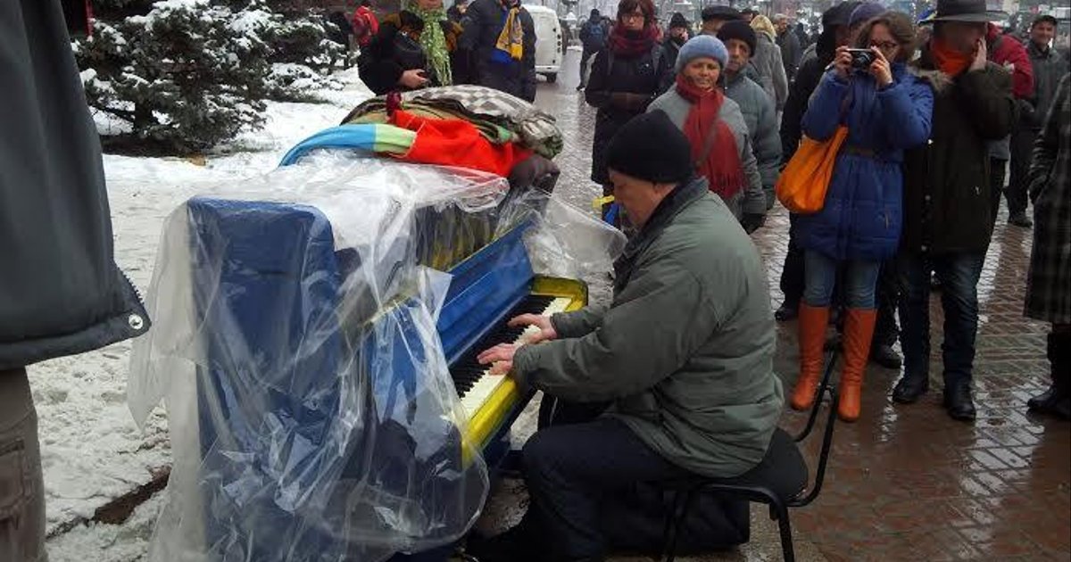 Под аккомпанемент музыканта Владимира Бурневского люди поют украинские песни, передает Цензор.НЕТ. Музыкант стал спонтанно играть на пианино, люди подходили и пели украинские народные и известные эстрадные песни.