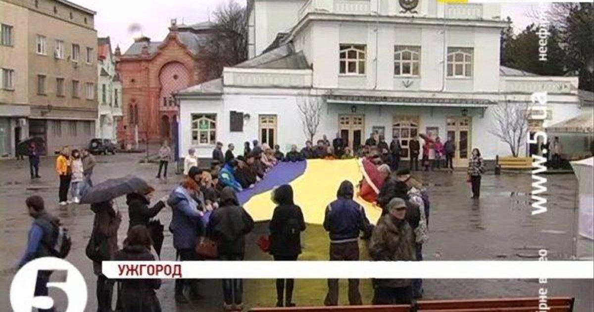 25-метровый украинский флаг в поддержку Крыма развернули в центре Ужгорода.