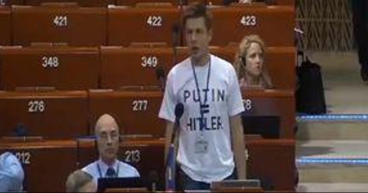 Как сообщает Цензор.НЕТ со ссылкой на Новый Регион, сделал он это в футболке с надписью "PUTIN=HITLER". Это вызвало неудовольствие российской делегации, они начали кричать, и председатель австриец Хервиг Ван Стаа потребовал выключить ему микрофон.