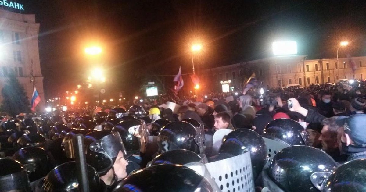 "Пророссийски настроенные и российские граждане сейчас прорвали первую линию обороны милиции около ОГА. Тащат шины,кидают в милицию взрывпакеты", - написало позже издание.