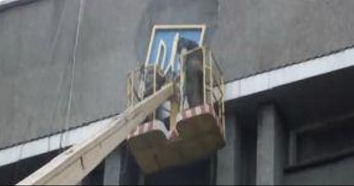 Как сообщает Цензор.НЕТ со ссылкой на Новости Донбасса, боевики подогнали к зданию автомобиль-вышку. Двое сепаратистов в балаклавах в люльке поднялись на высоту Герба и сняли.