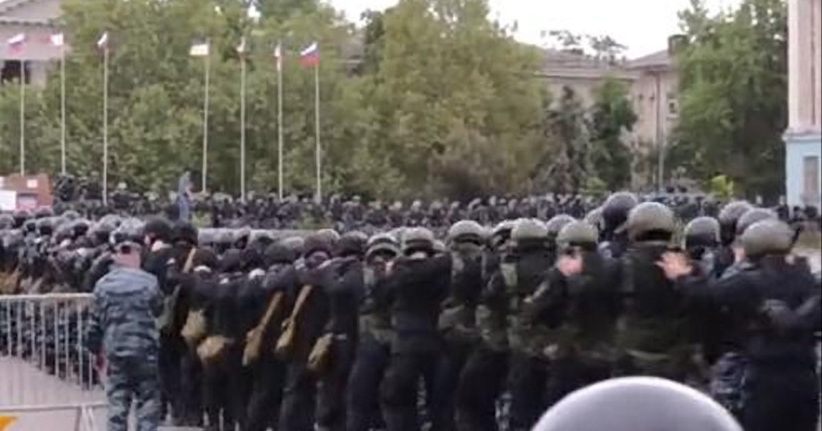Центральная площадь Симферополя в субботу была заполнена российскими силовиками, которые проводили специальные учения, готовясь ко Дню депортации крымскотатарского народа, отмечаемому в воскресенье, 18 мая. В учениях учувствовали по меньшей мере несколько сотен ОМНОвцев. На центральных улицах стоят автозаки, а также несколько БТРов.
