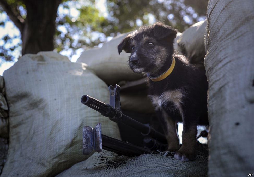 Щенок на боевой позиции украинских военнослужащих неподалеку от Славянска, 3 июля 2014.