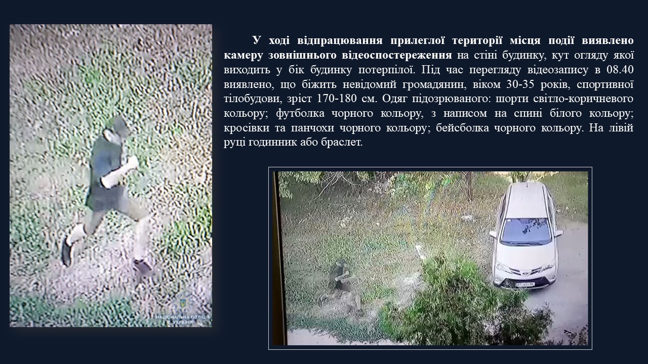 В ході відпрацювання прилеглої території, виявлено камеру зовнішнього відеоспостереження, яка зафіксувала одного із можливих злочинців.