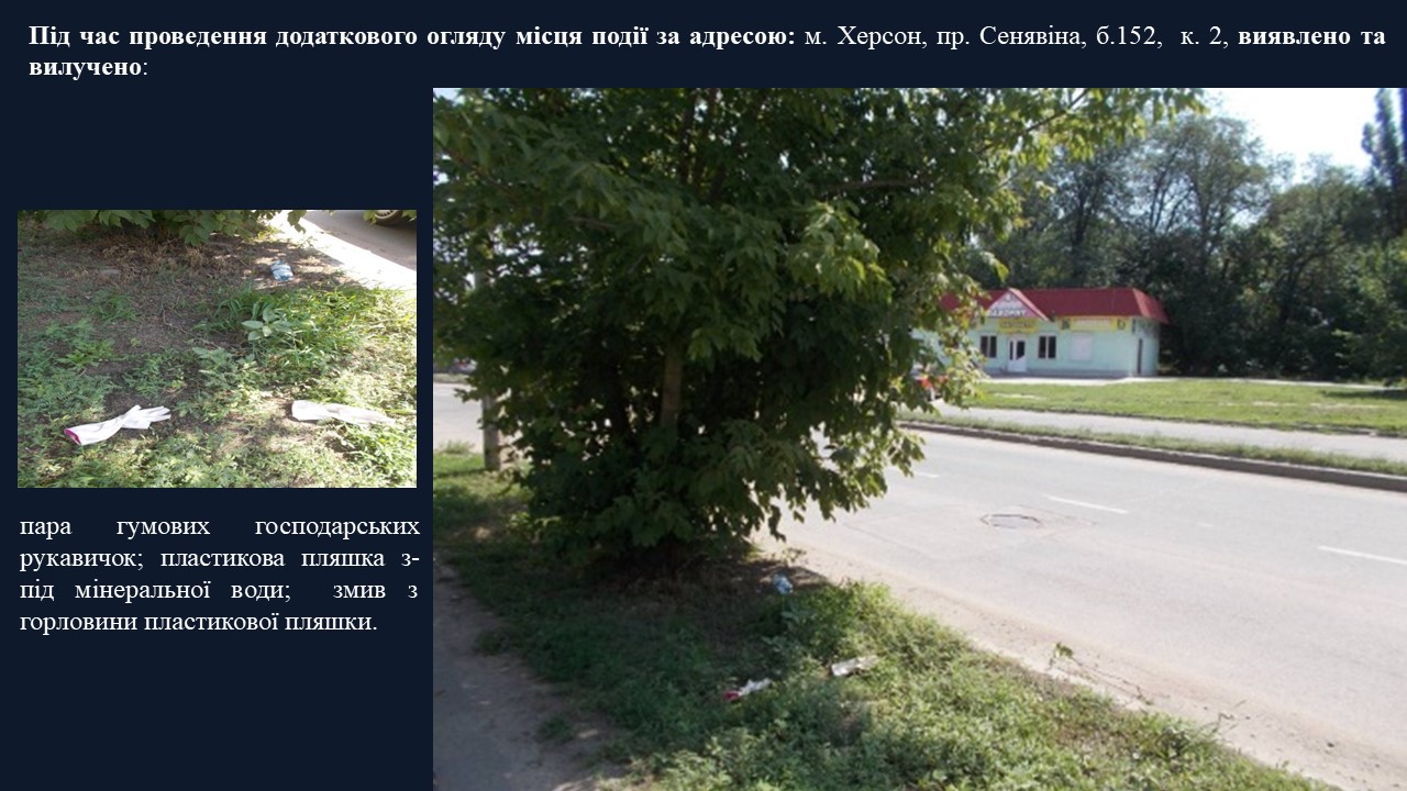 На місці вчинення злочину та за напрямком відходу злочинця поліцією вилучено одяг потерпілої, пару гумових рукавичок, скляну банку.