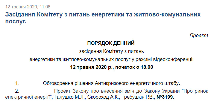 В повестке дня, опубликованной на сайте комитета, - два вопроса: обсуждение решения Антикризисного энергетического штаба и проекта №3199, предусматривающего изменения закона "О рынке электроэнергии".