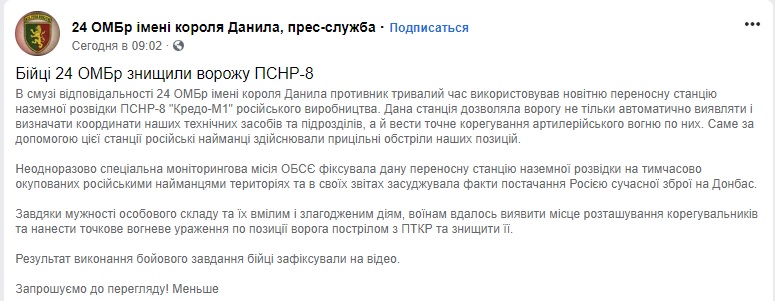 В полосе ответственности 24 ОМБр имени короля Даниила противник длительное время использовал новую переносную станцию наземной разведки ПСНР-8 "Кредо-М1" российского производства. Украинские воины выстрелом из ПТУР уничтожили позицию врага.