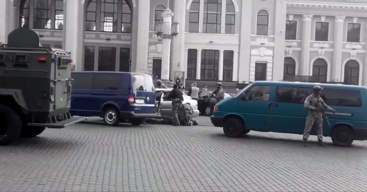 На кадрах видно, как два микроавтобуса с вооруженными бойцами блокируют легковой автомобиль "Ланос". Затем сотрудники СБУ вытащили двух мужчин из автомобиля, обыскали его и уехали с места задержания. \
