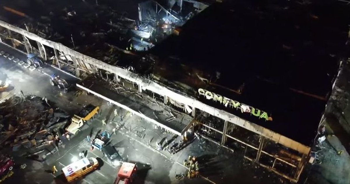 В сеть попали кадры разрушенного российскими ракетами ТЦ "Амстор" в Кременчуге.