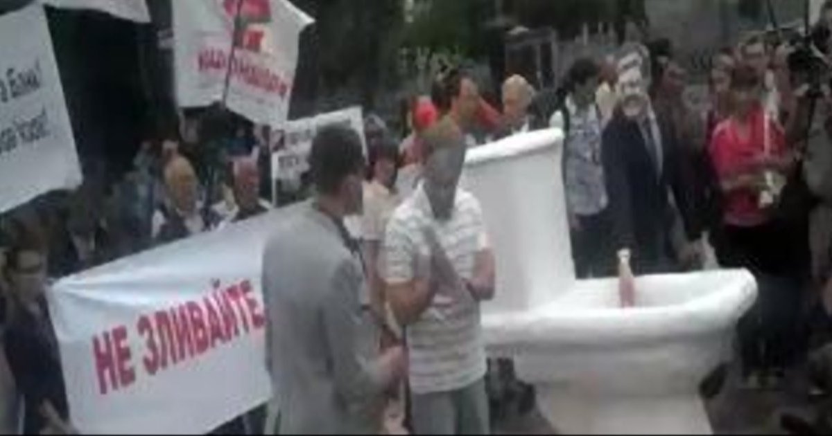 После их выступления активисты провели флешмоб, где люди в масках экс-генпрокуроров Махницкого, Яремы а также нынешнего прокурора Шокина передавали "Порошенко" дела представителей прошлой власти - Табачника, Пшконки, Якименко и беглого экс-президента Януковича, который сливал их в унитаз.