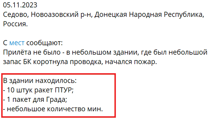 Вечером 5 ноября в оккупированном городе Седово Донецкой области взорвался российский склад с боеприпасами.
