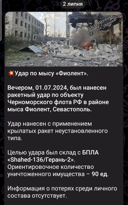 "В который раз "уничтоженные" вражеской пропагандой украинские самолеты продолжают успешно выполнять боевые задачи, наносят ракетно-бомбовые удары по позициям оккупантов и ликвидируют важные военные объекты в глубоком тылу противника. 1 июля 2024 года украинские пилоты нанесли сокрушительный удар по складу боеприпасов в Крыму", - говорится в сообщении.