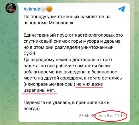 "Уничтожен 3.08 российский бомбардировщик Су-34 на военном аэродроме Морозовск, Ростовской области", - отмечает в комментарии автор публикации.