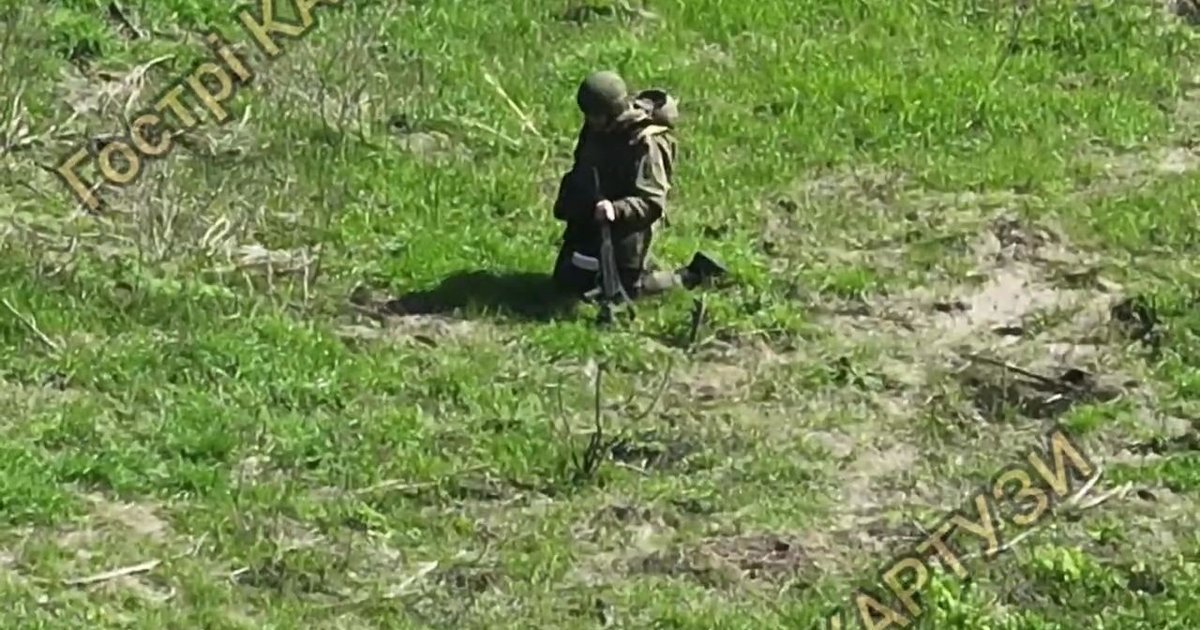 Солдат армии РФ на коленях, опираясь на автомат, ползет по полю на Кураховском направлении. ВИДЕО